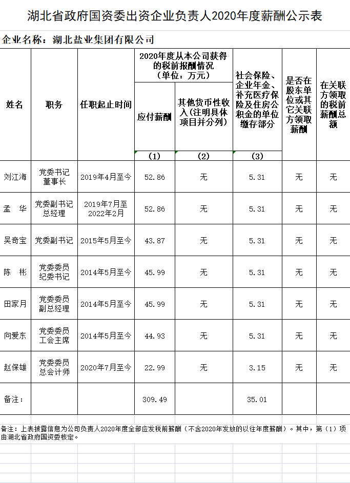 湖北省政府國資委出資企業(yè)負(fù)責(zé)人2020年度薪酬公示