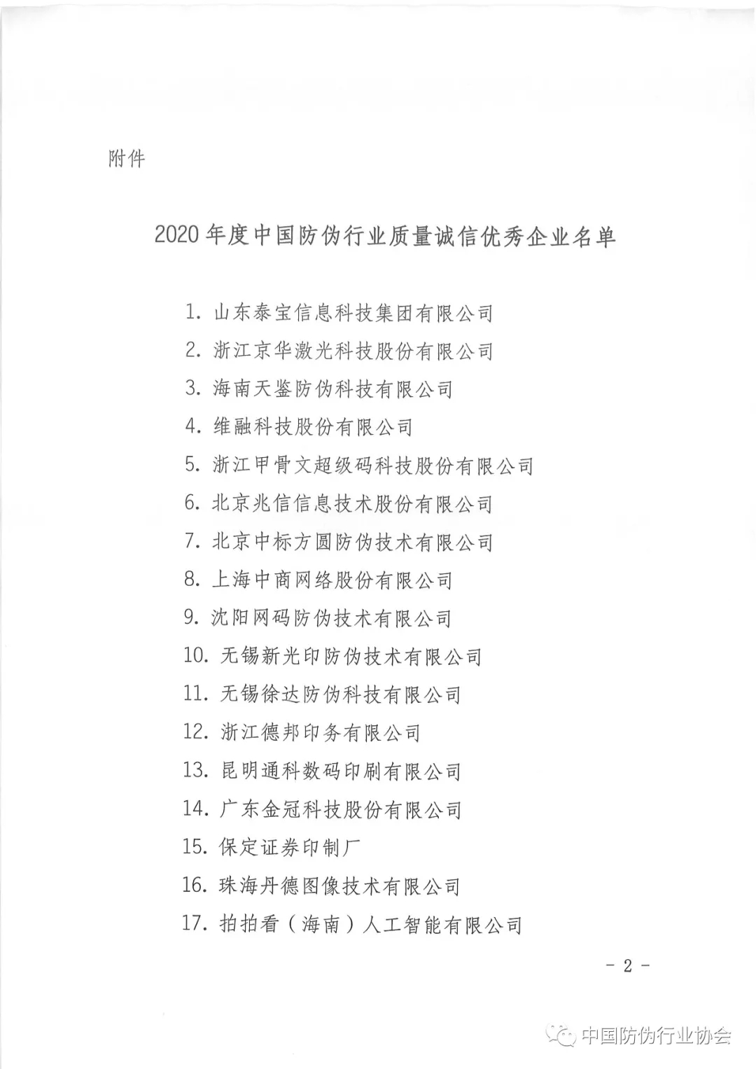 關(guān)于“2020年度中國防偽行業(yè)質(zhì)量誠信優(yōu)秀企業(yè)”名單的公告